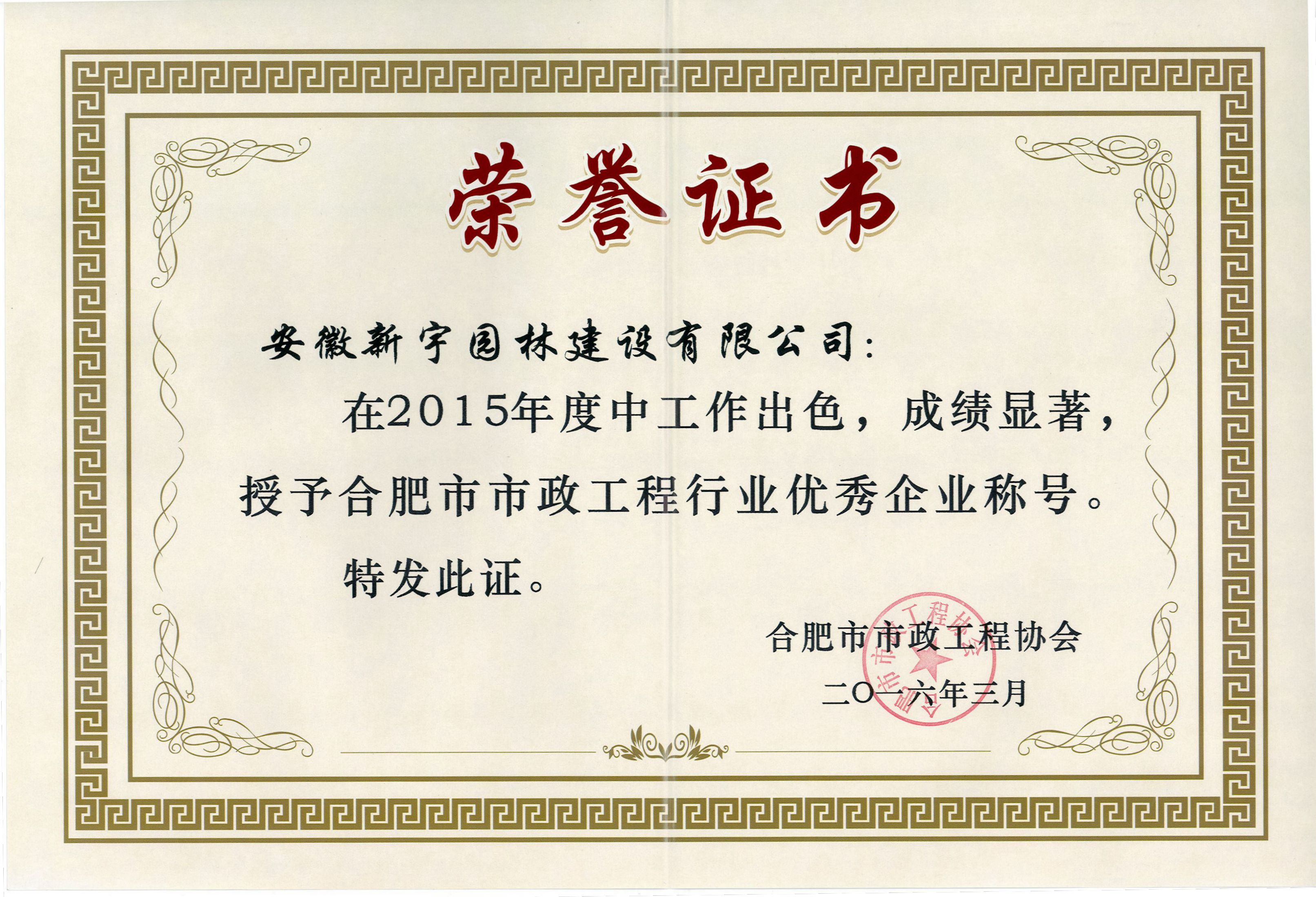恭賀新宇園林榮獲2015年度合肥市市政政工程優(yōu)秀企業(yè)、優(yōu)秀項(xiàng)目經(jīng)理
