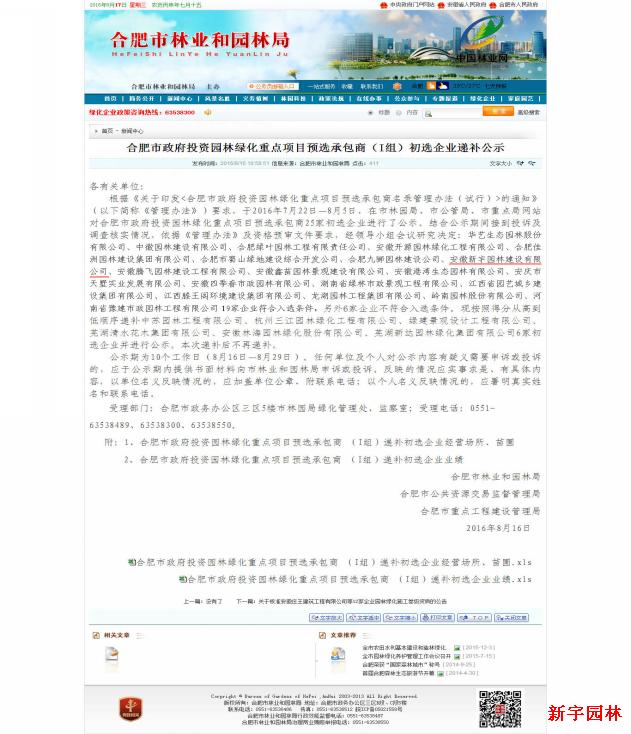 2016年8月16日,合肥市林業(yè)和園林局網(wǎng)站公布了首批25家合肥市政府投資園林綠化重點(diǎn)項目預(yù)選承包商(I組)名單,安徽新宇園林建設(shè)有限公司成功入圍,位列第八名。