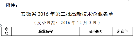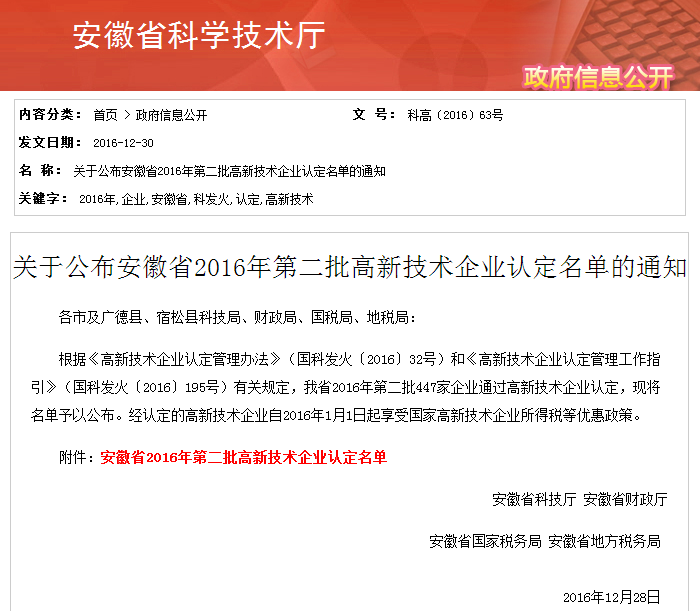 2016年12月28日,安徽省科技廳、安徽省財(cái)政廳、安徽省國家稅務(wù)局及安徽省地方稅務(wù)局聯(lián)合發(fā)文公布了安徽省2016年第二批高新技術(shù)企業(yè)認(rèn)定名單,安徽新宇生態(tài)園林股份有限公司(原安徽新宇園林建設(shè)有限公司)順利通過認(rèn)定并加入到國家級高新技術(shù)企業(yè)行列。