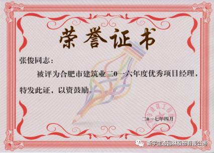 項(xiàng)目經(jīng)理張俊喜獲“合肥市建筑業(yè)2016年度優(yōu)秀項(xiàng)目經(jīng)理”稱號(hào)