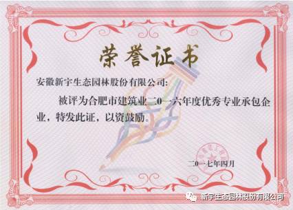 為樹立典型,弘揚(yáng)先進(jìn),合肥市建筑工程協(xié)會(huì)以“全省爭(zhēng)第一 全國(guó)創(chuàng)一流”為目標(biāo),開展了合肥市建筑業(yè)2016年度評(píng)比表彰活動(dòng)。2017年4月,經(jīng)協(xié)會(huì)組織相關(guān)部門評(píng)審,安徽新宇生態(tài)園林股份有限公司榮獲“合肥市建筑業(yè)2016年度優(yōu)秀企業(yè)”稱號(hào),項(xiàng)目經(jīng)理張俊榮獲“合肥市建筑業(yè)2016年度優(yōu)秀項(xiàng)目經(jīng)理”稱號(hào)。