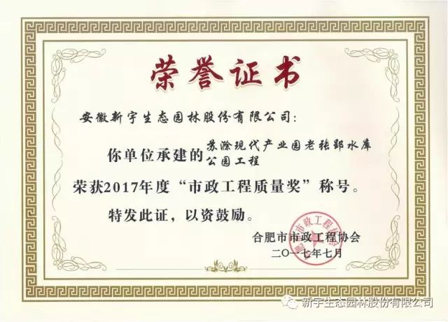 為促進(jìn)市政工程質(zhì)量進(jìn)一步提高,鼓勵(lì)各企業(yè)加強(qiáng)科學(xué)管理,嚴(yán)格施工過(guò)程質(zhì)量控制,推動(dòng)科技進(jìn)步,爭(zhēng)創(chuàng)質(zhì)量高、成本低、經(jīng)濟(jì)效益好的精品工程,2017年7月,合肥市市政工程協(xié)會(huì)組織相關(guān)部門(mén)進(jìn)行市政工程質(zhì)量獎(jiǎng)的評(píng)審工作,我公司承建的“蘇滁現(xiàn)代產(chǎn)業(yè)園老張郢水庫(kù)公園工程”榮獲2017年度“市政工程質(zhì)量獎(jiǎng)”稱號(hào)。