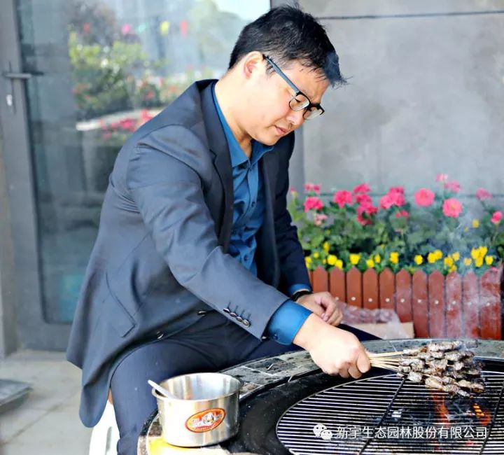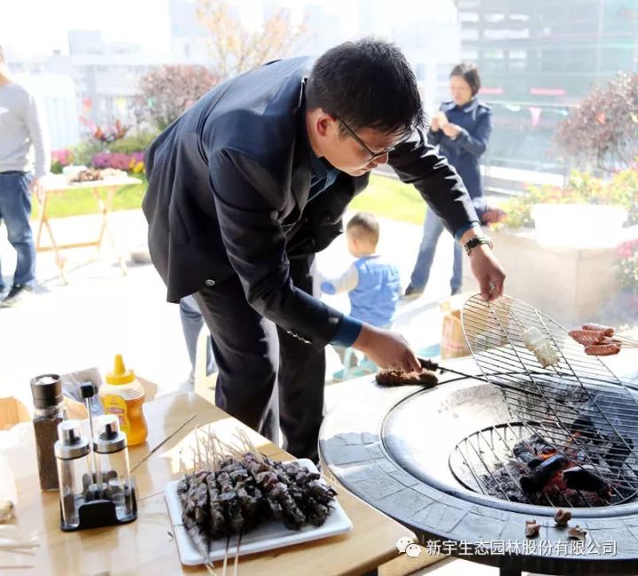 活動現場,組裝燒烤架、生火、刷油、翻轉、撒鹽和調料,員工自行選擇食材進行烤制食用,整個過程讓大家著實感受了一把“自己動手豐衣足食”的樂趣,新宇生態(tài)的“大家長”——張友德董事長更是親身參與到活動中,為員工烤制美味的食物。