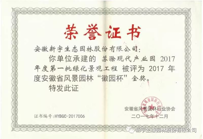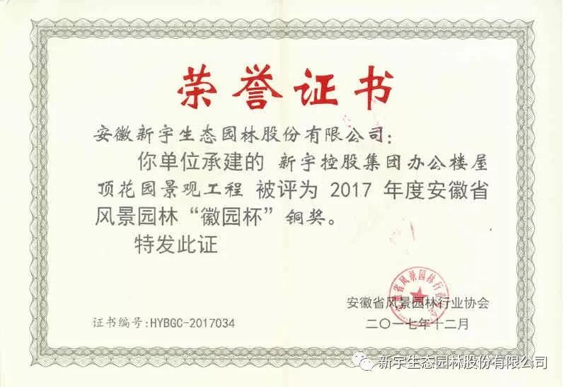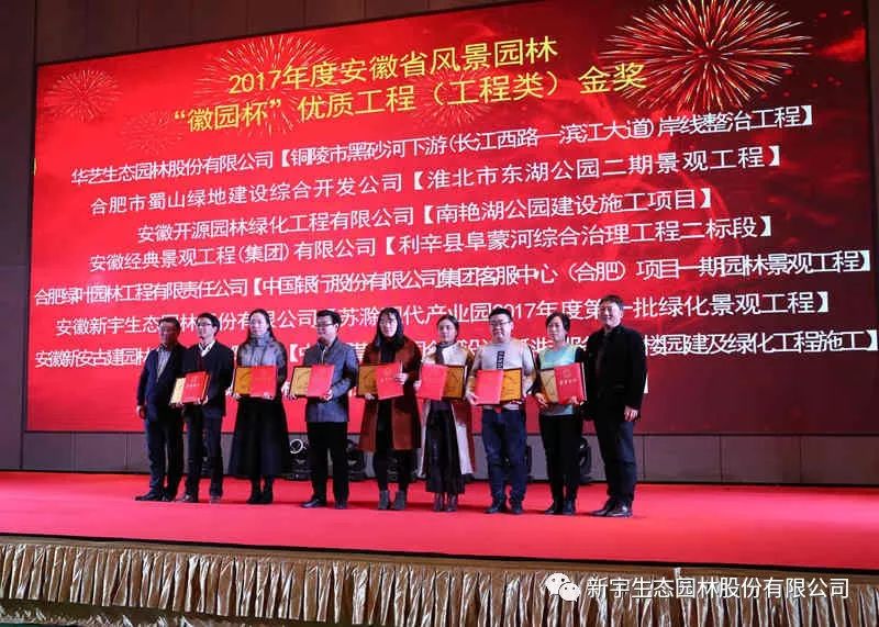 會(huì)議期間還公布了2017年度安徽省“徽?qǐng)@杯”園林綠化優(yōu)質(zhì)工程獲獎(jiǎng)名單并組織頒獎(jiǎng)儀式,我單位承建的“蘇滁現(xiàn)代產(chǎn)業(yè)園2017年度第一批綠化景觀工程”、“新宇控股集團(tuán)辦公樓屋頂花園景觀工程”分別榮獲優(yōu)質(zhì)工程金獎(jiǎng)和銅獎(jiǎng)。“一分耕耘,一分收獲”,新宇生態(tài)將繼續(xù)走在生態(tài)園林行業(yè)發(fā)展的前沿,為傳承創(chuàng)新徽派園林文化藝術(shù),推動(dòng)中華園林文化創(chuàng)新發(fā)展,做出了當(dāng)代風(fēng)景園林人新的作為。