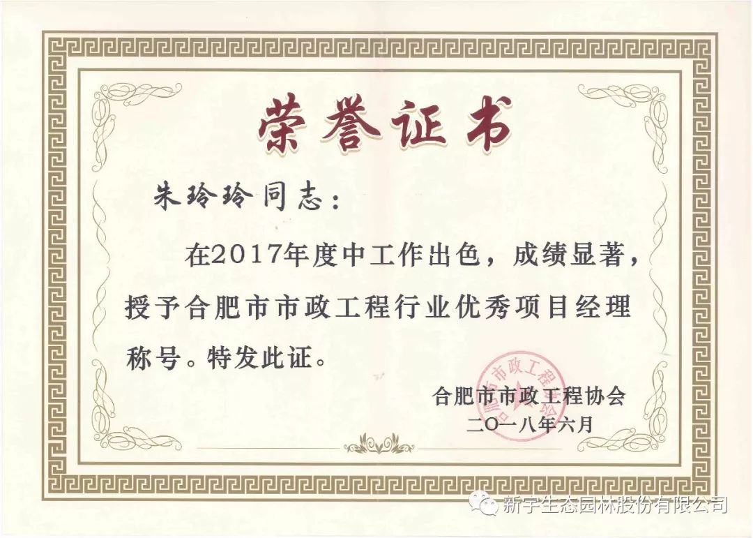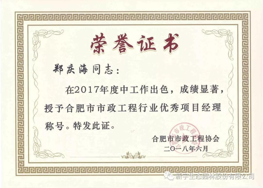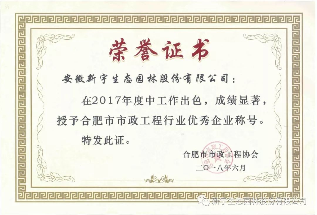 2018年6月28日,合肥市市政工程協(xié)會三屆五次會員大會在合肥市隆重召開,會議對2017年度合肥市市政工程行業(yè)優(yōu)秀企業(yè)和優(yōu)秀項(xiàng)目經(jīng)理進(jìn)行表彰并頒獎。安徽新宇生態(tài)園林股份有限公司榮獲合肥市市政工程行業(yè)優(yōu)秀企業(yè)稱號,朱玲玲、鄭慶海榮獲優(yōu)秀項(xiàng)目經(jīng)理稱號。