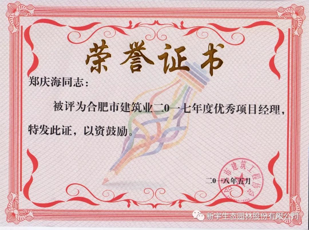 近日,根據(jù)《合肥市建筑業(yè)2017年度優(yōu)秀企業(yè)評選辦法》,經(jīng)市建委、市建筑工程協(xié)會等相關部門評審決定,新宇生態(tài)在眾多建筑企業(yè)中名列前茅,被評為合肥市建筑業(yè)2017年度優(yōu)秀專業(yè)承包企業(yè),鄭慶海榮獲優(yōu)秀項目經(jīng)理稱號。