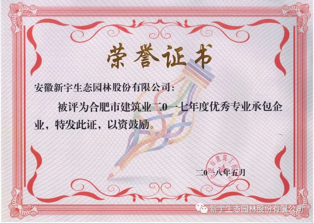 新宇生態(tài)獲合肥市優(yōu)秀專業(yè)承包企業(yè)稱號