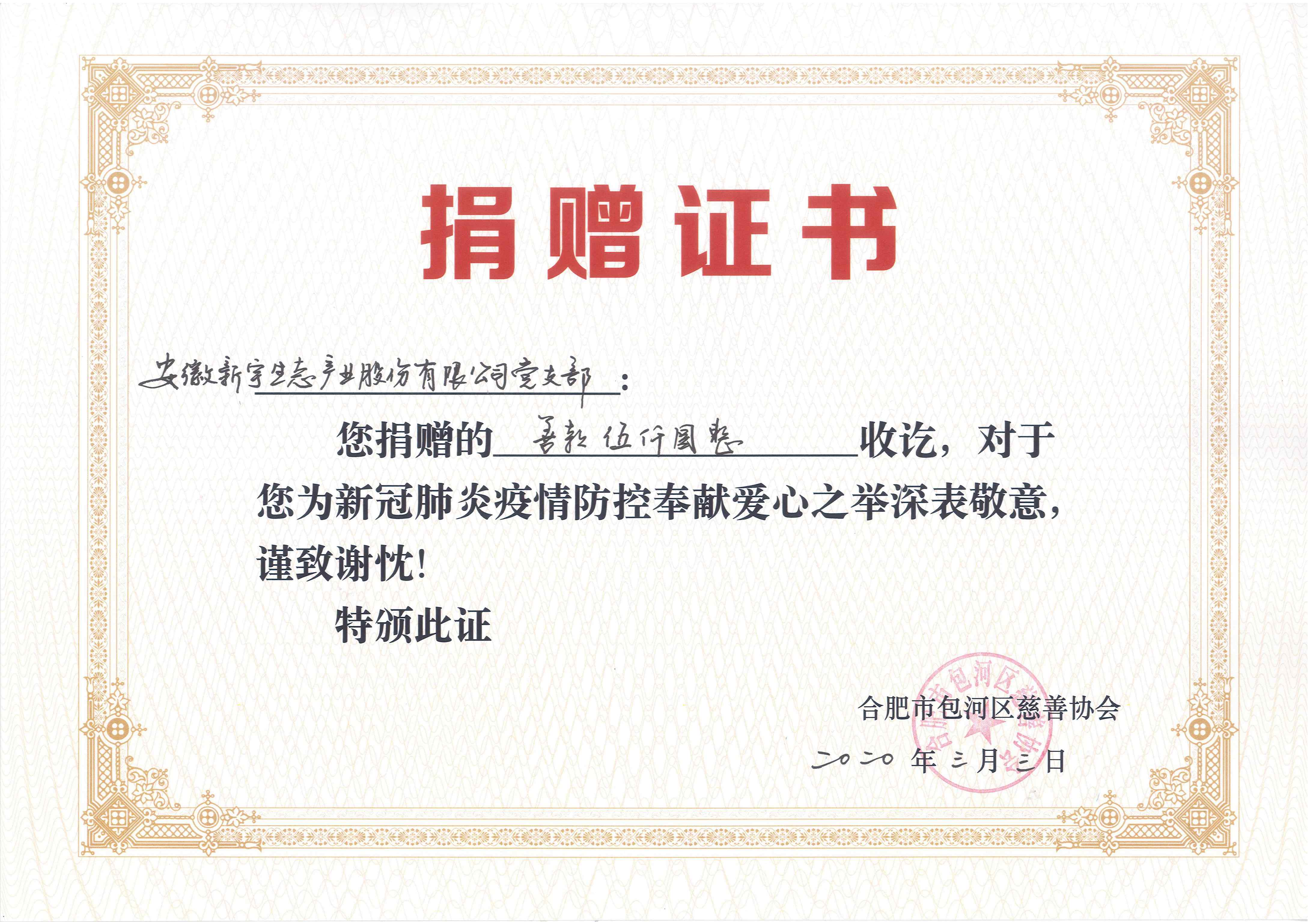 點(diǎn)點(diǎn)愛心匯集成抗議前線的力量。作為包河區(qū)轄區(qū)企業(yè),包河經(jīng)開區(qū)商會副會長單位安徽新宇生態(tài)產(chǎn)業(yè)股份有限公司及其黨支部第一時間向合肥市包河區(qū)慈善協(xié)會捐贈防疫資金35000元,用于包河區(qū)防疫物資采購。