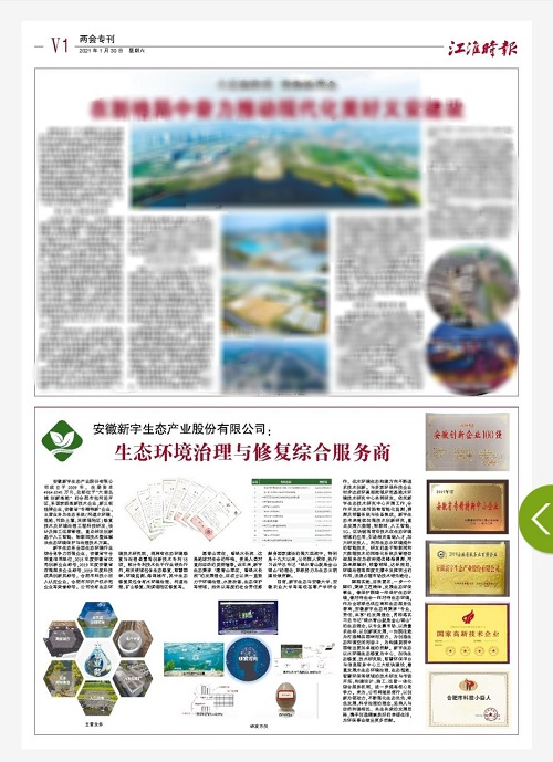 2021年新年伊始,安徽省“兩會”期間?!督磿r報》在“兩會??卑婷嫒鎴蟮馈吧鷳B(tài)環(huán)境治理與修復綜合服務商—安徽新宇生態(tài)產業(yè)股份有限公司”。