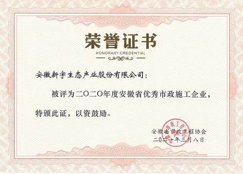 安徽新宇生態(tài)產(chǎn)業(yè)股份有限公司榮獲2020年度“安徽省優(yōu)秀市政施工企業(yè)”榮譽(yù)稱(chēng)號(hào)。