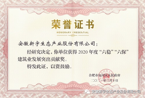 近日,新宇生態(tài)憑借為地方經(jīng)濟(jì)社會發(fā)展作出的貢獻(xiàn)和取得的良好品牌形象,被合肥市包河區(qū)授予“2020年度‘六穩(wěn)’‘ 六保’建筑業(yè)發(fā)展突出貢獻(xiàn)獎”榮譽(yù)稱號。