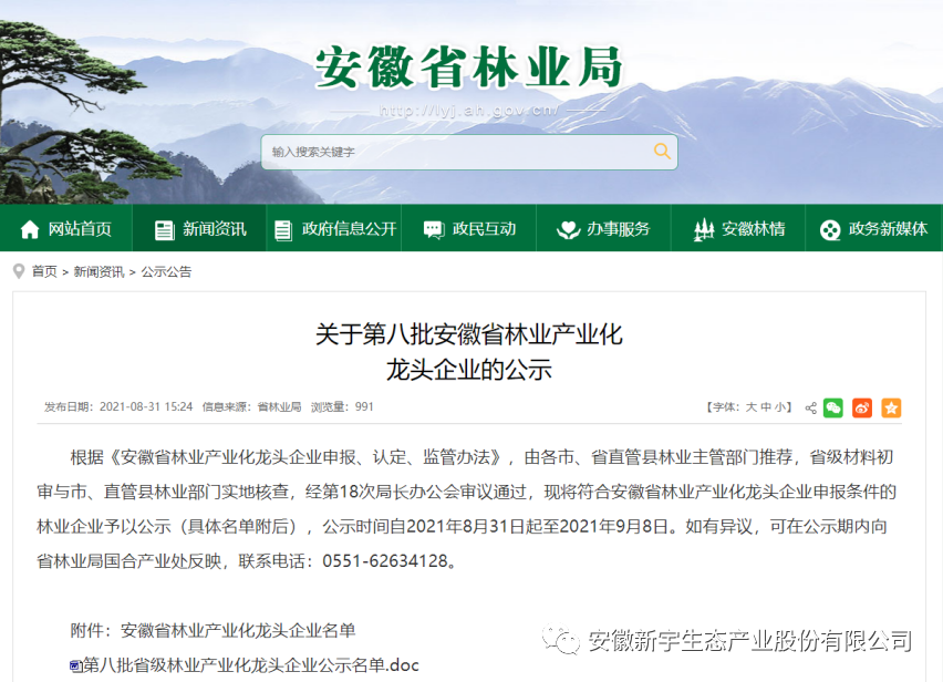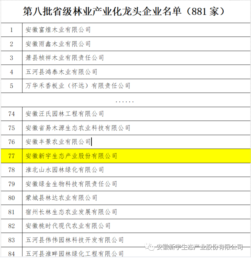 2021年8月31日,根據(jù)《安徽省林業(yè)產(chǎn)業(yè)化龍頭企業(yè)申報(bào)、認(rèn)定、監(jiān)管辦法》,安徽省林業(yè)局組織開(kāi)展了第八批省林業(yè)產(chǎn)業(yè)化龍頭企業(yè)的申報(bào)工作,由各市、省直管縣林業(yè)主管部門(mén)推薦,省級(jí)材料初審與市、直管縣林業(yè)部門(mén)實(shí)地核查,經(jīng)第18次局長(zhǎng)辦公會(huì)審議通過(guò),擬確定新增安徽新宇生態(tài)產(chǎn)業(yè)股份有限公司等183戶企業(yè)為第八批省林業(yè)產(chǎn)業(yè)化龍頭企業(yè)。
