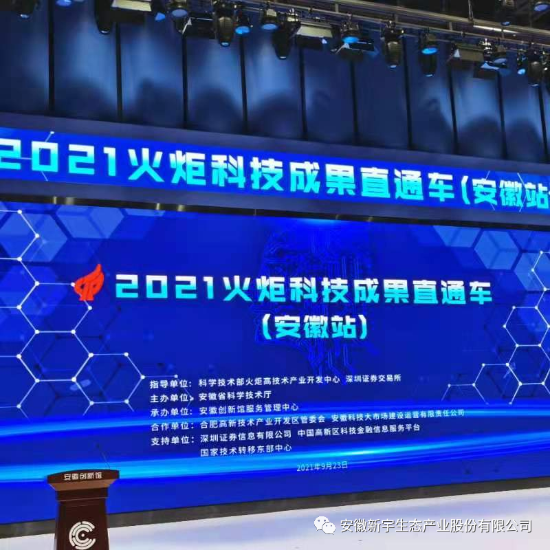 2021年9月23日上午,由科學(xué)技術(shù)部火炬高技術(shù)產(chǎn)業(yè)開發(fā)中心、深圳證券交易所指導(dǎo),由安徽省科學(xué)技術(shù)廳主辦的2021火炬科技成果直通車(安徽站)活動在安徽創(chuàng)新館舉辦,安徽省省委常委、常務(wù)副省長、省政協(xié)副主席鄧向陽出席活動并致辭,省政府副秘書長李必方、省科技廳廳長羅平出席,合肥市市委副書記、市長羅云峰出席活動并致辭,安徽新宇生態(tài)產(chǎn)業(yè)股份有限公司董事長張友德應(yīng)邀參加本次活動并簽約政產(chǎn)學(xué)研用金成果轉(zhuǎn)化項目融資協(xié)議。