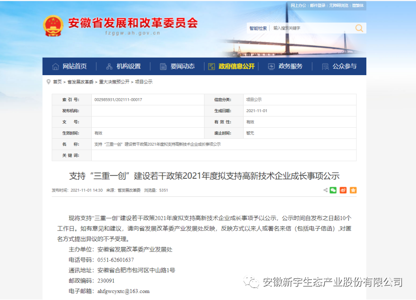 2021年11月1日,根據(jù)《支持“三重一創(chuàng)”建設若干政策》(皖政〔2017〕51號)、《安徽省人民政府關于推進重大新興產業(yè)基地高質量發(fā)展若干措施的通知》(皖政〔2019〕30號)和《安徽省發(fā)展改革委關于開展2021年度支持“三重一創(chuàng)”建設若干政策相關事項申報工作的通知》要求,經資格審查、資料審核、專家評審和廳黨組會議審議等程序,并經省發(fā)改委審批公示(《支持“三重一創(chuàng)”建設若干政策2021年度擬支持高新技術企業(yè)成長事項公示》),擬確定安徽新宇生態(tài)產業(yè)股份有限公司等341戶企業(yè)榮獲2021年度安徽省支持“三重一創(chuàng)”建設若干政策支持高新技術企業(yè)成長項目獎,我單位榮獲安徽省支持高新技術企業(yè)2類項目獎金100萬元。