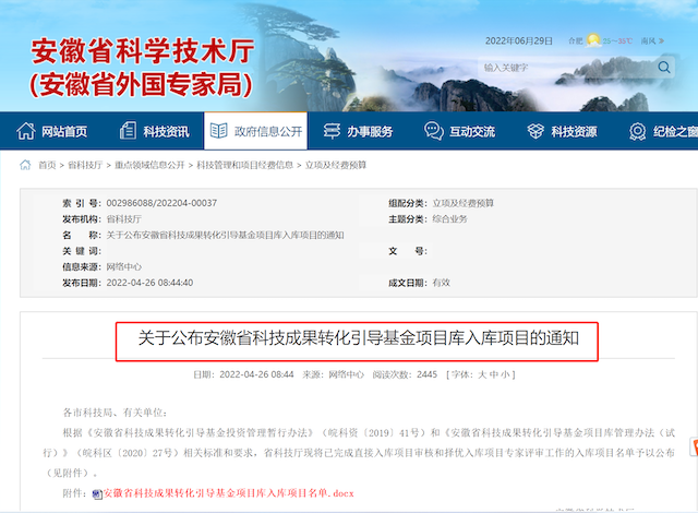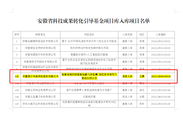 安徽新宇環(huán)??萍脊煞萦邢薰窘?jīng)市、省審核審批直接入庫安徽省科技成果轉(zhuǎn)化引導(dǎo)基金項目庫。