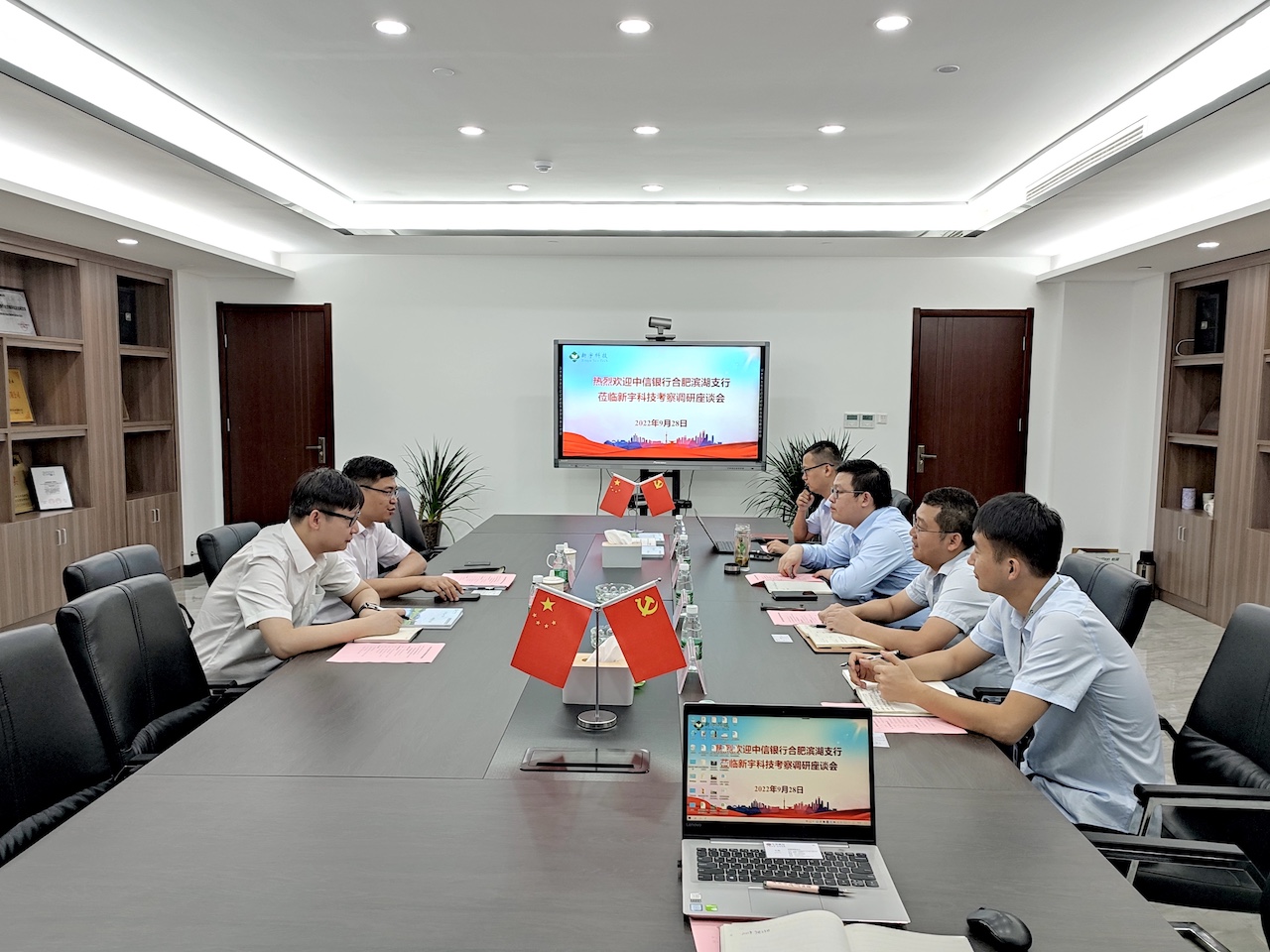 2022年9月28日上午,中信銀行合肥濱湖支行行長王亮一行蒞臨新宇科技考察調(diào)研,新宇科技張友德董事長熱情接待,公司董事、副總經(jīng)理張軍、副總經(jīng)理錢益武博士及投融資部相關人員參加座談會。