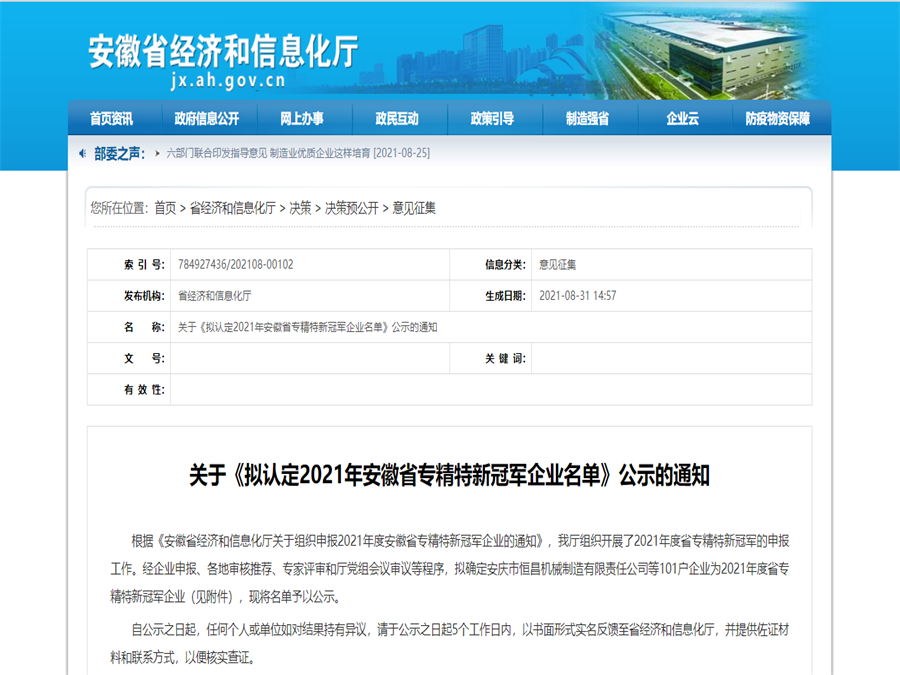 2021年8月31日,根據《安徽省經濟和信息化廳關于組織申報2021年度安徽省專精特新冠軍企業(yè)的通知…