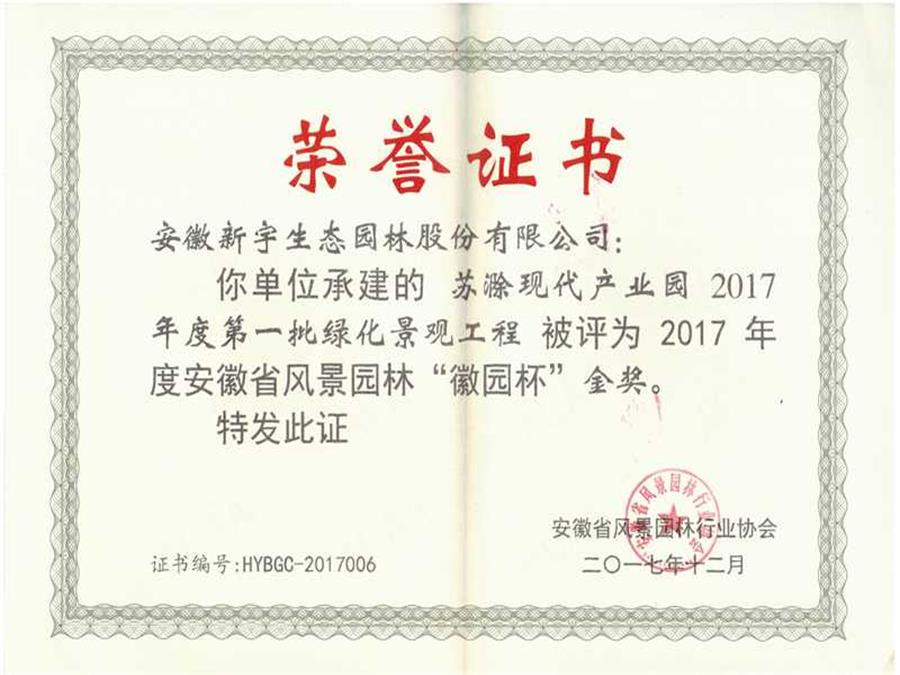 熱烈恭賀新宇生態(tài)榮獲“徽園杯”園林綠化優(yōu)質工程金獎