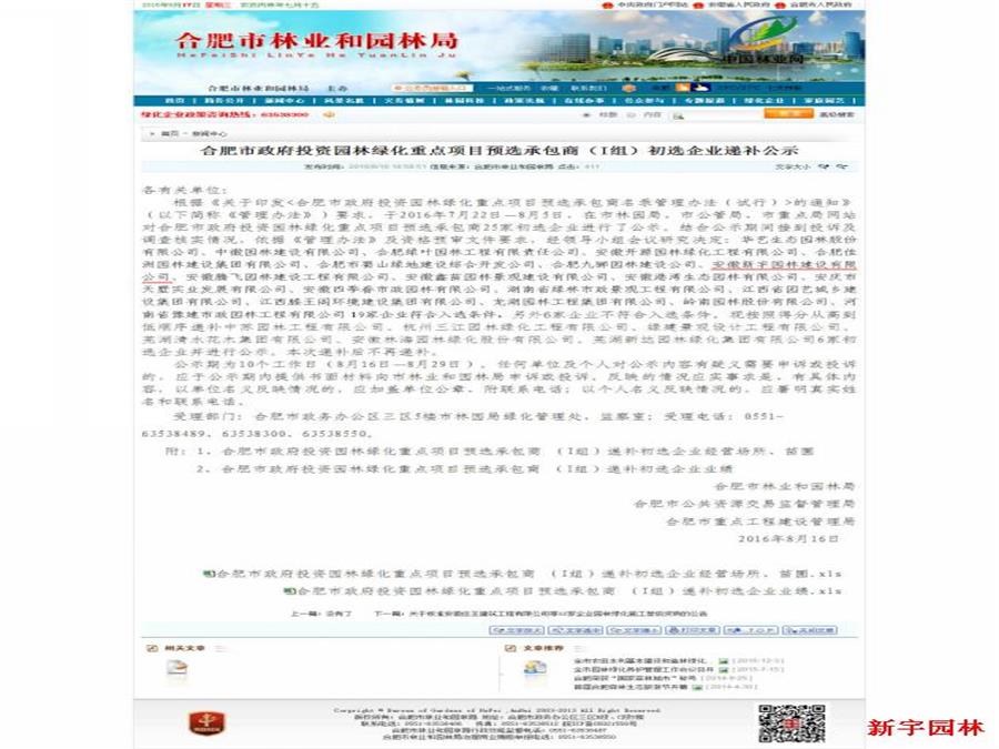2016年8月16日,合肥市林業(yè)和園林局網(wǎng)站公布了首批25家合肥市政府投資園林綠化重點(diǎn)項(xiàng)目預(yù)選承包商…